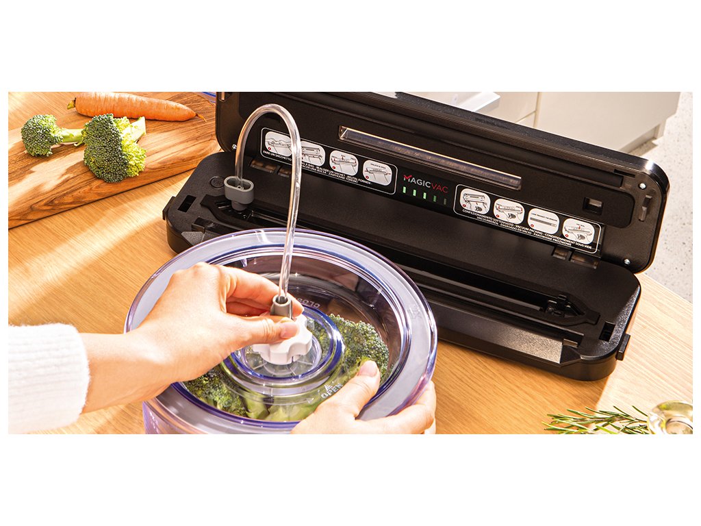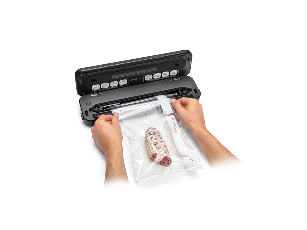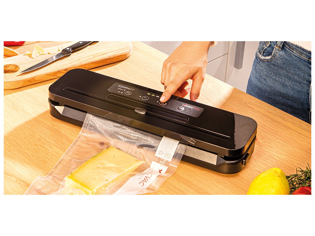 Balička MagicVac Compact je určená na občasné vákuové balenie, disponuje všetkými dôležitými funkciami ako možnosť manuálneho zastavenia vákuového balenia, alebo použitie príslušenstva (nádoby, viečka). LED displej zložený z piatich diód úplnú kontrolu nad priebehom balenia. Zváracia lišta so šírkou 30 cm umožňuje použitie všetkých vákuových vreciek a roliek (s výnimkou šírky 400 mm) z našej ponuky.
